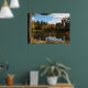 Cette belle affiche de voyage en beaux-arts présente une jeune femme assise et rêvant sur le quai au bord d'un grand étang en Nouvelle-Angleterre. L'automne est dans l'air. L'eau est entourée d'arbres aux magnifiques couleurs feuillues d'automne, jaune, vert, rouge, orange et or. Le ciel bleu est couvert de nuages blancs et tout cela se reflète dans l'eau. Le tronc d'un grand pin définit le côté gauche. Le brillant soleil se reflète dans ses cheveux rouges.