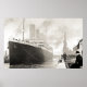 C'est une autre vue du grand navire qui quitte le port. Sur cette photo, elle s'est retirée du quai. Un remorqueur à vapeur est juste visible du côté tribord.