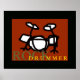Classic rock drummer cool print to decor the musician room walls - a graphic illustration of a drum on red background and a black frame, with the words rock drummer