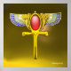 Symbole égyptien de la vie éternelle Ankh avec ailes bleues dorées, motifs de maïs et pierre rouge éclatante.Design élégant bijou en arrière - plan jaune, partie de la collection Hyper Talismans. modélisation, design & rendu par Bulgan Lumini. c)