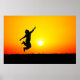 Une fille sautant dans l'air sur le sommet d'une colline devant un coucher de soleil rouge sang