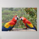 Photo de deux scarlet mackaws dans la nature, assis sur une fontaine et mangeant des fruits. Cette photo de maquaw a été prise au Costa Rica tropical. Les plumes rouges, jaunes et bleues du perroquet sont brillantes contre l'arrière - plan des arbres tropicaux et des champs de fleurs et de cultures. Ce mignon couple d'oiseaux ferait un grand cadeau de Saint Valentin et peut être facilement customisé et imprimé sur de nombreux produits différents. Célébrez l'amour et l'amour dans le monde des oiseaux avec ces images touchantes de maquis!