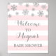 Bienvenue sur l'affiche Baby shower avec nom personnalisé en rayures roses et blanches motif avec des flocons de neige argentés pour l'hiver ou Noël.