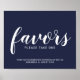Script moderne Marine Blue Wedding Favors Signe avec titre en blanc police de caractères modernes avec détails en blanc police sans serif moderne sur arrière - plan bleu marine.