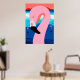 A digitally created artwork of flamingos watching the sun set behind the mountains in the background.