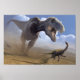 OEuvre d'un Tyrannosaurus rex dinosaure à la recherche d'un dinosaure Ornithomimus. T. rex était l'un des plus grands dinosaures carnivores. Il mesurait environ 6 mètres et pesait environ 7 tonnes. T. rex a vécu en Amérique du Nord et en Asie à la fin du Crétacé, il y a 85 à 65 millions d'années. La tête est fortement construite et a les dents pointues d'un prédateur. On pense que T. rex a récupéré et chassé pour se nourrir. Le dinosaure Ornithomimus mesurait environ 6 mètres de long et 2 mètres de haut. I