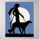 Une silhouette design art déco de femme et de chien dressée contre une lune blanche éclatante, arrière - plan bleu à silhouette noire.