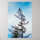 Une photographie d'un pygargue à tête blanche perché au sommet d'un grand pin. Un ciel bleu avec des nuages brumeux est à l'arrière-plan. Des traces de soleil et de neige peuvent être trouvées sur l'arbre et ses branches.