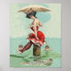 This is a vintage image of a Victorian Lady in an old fashioned red bathing holding an umbrella sitting on a post in the ocean. She est surrounded by male admirers swimming below. See my store art by MAR for matching products with this design.