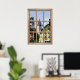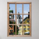 Poster qui ressemble à une fenêtre — ville autrichienne L'Autriche a de si jolies villes avec des bâtiments peints de couleurs vives et des églises à dôme d'oignon. Imaginez que vous puissiez vous réveiller avec cette vue... Vous pouvez avec cette photo qui ressemble à une fenêtre ! Derrière le cadre de la fenêtre en bois se trouve une jolie rue où se trouvent deux bâtiments de ville, l'un peint un joli jaune et l'autre un orange chaleureux, aux volets verts. Au-delà, on aperçoit le clocher et la flèche de l'église à dôme d'oignon. Prise dans la belle ville de Kitzbuehel dans les Alpes autrichiennes, Europe.