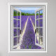 Vue de champ de lavande, fausse scène de fenêtre ouverte, pour un bureau sans fenêtre. Affiche d'illusion optique paysagère très réaliste qui aurait l'air superbe sur un mur de bureau ou d'étude.