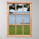 Une scène de faux fenêtre paisible. Surplombant des feuilles d'arbres et une fenêtre en bois encadrent ce décor relaxant d'une mer calme qui s'étend sur des collines bleues à l'horizon. Au premier plan se trouve une pelouse verte rafraîchissante. C'est comme avoir l'océan juste devant votre fenêtre ! Le "frame" est un bois de couleurs chaudes qui se marie à la plupart des décors. Une belle illusion pour créer une atmosphère apaisante dans n'importe quelle chambre.