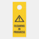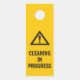 Nettoyage en cours de mise en garde porte bouton cintre en noir sur la prudence jaune avec un symbole d'alerte de prudence. Un service de nettoyage peut être accroché à la porte de la salle de bain ou à d'autres usages professionnels pour les personnes usées la chambre est fermée pour le nettoyage. Même conception de part et d'autre.