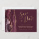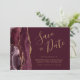 Cette élégante carte de dattes moderne comporte une bordure d'aquarelle bordeaux et ornée d'une parties scintillant en faux or. Le texte personnalisable combine écriture manuscrite couleur or, copperplate et polices italiques sur un arrière - plan bordeaux. L'envers est assorti d'un design d'agate bordeaux et or.