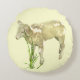 Ce coussin rond est composé d'un petit agneau doux, âgé de trois semaines. Il grignote sur l'herbe contre un arrière - plan jaune.