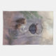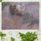 Une serviette de cuisine ou de thé avec une peinture numérique d'un verre de vin rouge avec quelques clous de girofle d'ail, et une suggestion de romarin et de sauge, sur un arrière - plan de couleurs en pastel chinées aux nuances de violet pourpre, du beige ou de bronzage et gris.
