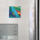 Des plumes d'artisanat rouge, aqua, jaune, orange, vert et bleu brillants rendent cet aimant unique