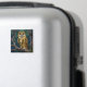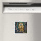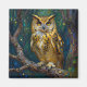 A beautiful magnet with a gold and blue owl sitting on a tree branch. This illustration has an impasto oil painting style.
