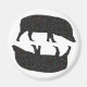 Cet aimant a deux cochons brillants dessus, l'un à l'envers et l'autre à l'envers. Les deux cochons sont noirs et recouverts de petits points multicolores.