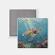A sea turtle themed magnet with an illustration of a sea turtle under a calm teal sea swimming among the coral on the ocean floor with sun rays beaming down on him through the aqua water. Add a coastal feeling to your beach home.