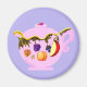 Aimant de théière aux fruits et Feuilles de Kristie Hubler aux feuilles ondulés, et baies comme framboise dorée ou d'automne, mûre (ou pourpre), framboise magenta, framboise bleue, mousses, bleuets, bleuets, mûres, pêche et tranche de pomme rouge sur un aimant rond