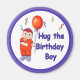 Ce design amusant présente un adorable petit garçon en rouge vif tenant un ballon. Des banderoles multicolores dans l'arrière - plan et le texte qui dit...Embrassez le garçon d'anniversaire. Parfait pour célébrer sa journée spéciale.