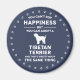 Vous ne pouvez pas acheter le bonheur mais vous pouvez adopter un Terrier tibétain et c'est à peu près la même chose en majuscules blanches sans serif avec la silhouette d'une race de chien de type Terrier tibétain. Encadré dans un anneau d'empreintes de pattes blancs.