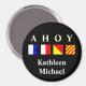 Ahoy a écrit dans les drapeaux... avec la traduction juste au-dessus. Si vous croisez bientôt, cet aimant est le "marqueur" parfait pour votre porte cabine ! Personnalisé avec votre prénom ou votre nom de famille.