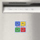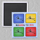 Cet aimant représente quatre icônes colorées (rouge, jaune, vert, bleu) avec une rameuse en silhouette. La légende est "ROWING TO WIN", et WIN est choisi deux fois en rouge.