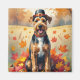 Un tableau aquarelle d'un chien gai assis au milieu d'un tas de feuilles d'automne vibrantes, entouré de minuscules citrouilles et de glands épars. Le chien porte un petit casquette pèlerin et des poutres de joie, capturant l'esprit de Thanksgiving. Dans l'arrière - plan, les champs de moissons et les arbres dorés créent une ambiance campagnarde paisible. Des textures douces et des tons d'automne chauds et feutrés confèrent à la scène une atmosphère cosy et nostalgique parfaite pour célébrer la beauté de la saison.