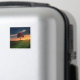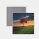 A beautiful photograph of a sunset with a single red tree standing on a lush hill. Interesting and moody contrast with dark gloomy clouds and bright sunlight illuminating the ground below with an orange yellow cloudless sky shining in the background. Wonderful play of light and shadow.