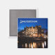 Aimant photo souvenir avec les vieilles maisons romantiques de la ville d'Amsterdam, construit le long du canal Prinsengracht, avec le reflet des lumières dans l'eau calme au début de la nuit dans la capitale de la Hollande avec le texte 'Amsterdam'.