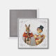 Sur cette image qui paraissait jadis un accueil de Pâques victorien, un lapin anthropomorphe dans une veste rouge joue de la trompette tandis qu'un poulet portant un chapeau chante.