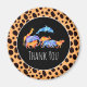 Un aimant de remerciement conçu avec un motif empreinte de léopard orange exotique pour un arrière - plan. Le dessus est recouvert d'un cadre circulaire noir avec une bordure blanche. Illustré avec une aquarelle numérique d'un troupeau d'animaux sauvages qui courent ensemble. Les animaux comprennent un dauphin saut, une girafe, un éléphant, un lion, un kangourou, un rhinocéros et un chat sauvage.