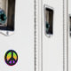Un arrière - plan arc-en-ciel lumineux et funky avec un symbole de paix noir.