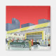 Illustration vintage de voyage d'affaires et conception de transport mettant en vedette des personnes dans une station-service de véhicules automobiles. Il y a des mécaniciens automobiles et des préposés à la station-service ainsi qu'un magasin de pièces automobiles. Les gens pompent de l'essence et font réparer leurs voitures au service complet de la voiture.