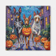 Adorables Kelpies australiens vêtus de costumes de Halloween ludiques portent des seaux de citrouille tout en faisant du porte-à-porte sous le ciel éclairé par la lune. Ce design festif met en valeur la silhouette élégante de la race, ses yeux alertes et son esprit travailleur, capturant parfaitement l'atmosphère effrayante mais amusante de la nuit d'Halloween. Une célébration animée pour les amoureux des chiens et les fans d'Halloween.