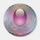 Un décor bleu pastel, lavande et rose avec un oeuf rose translucide dans un cadre argenté, entouré d'un cadre ovale argenté clair et composé de quatre pierres précieuses plus lisses comme des oeufs colorés.