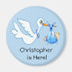 La mignonne Baby shower Party Favors dispose d'une cigogne portant un paquet de bébé garçon doux. Customisez avec le nom du bébé.