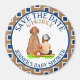 Brown et Bleu personnalisé Save the Date bouton avec un bébé garçon assis à côté d'un chien avec un thème de baseball.