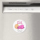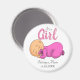 Un aimant de baby shower est un souvenir parfait pour vos invités à votre fête de bébé. Une petite fille endormie dans une grenouillère rose et suçant une tétine rose. Au-dessus, les mots C'est une fille en lettrage noir et rose tandis qu'en dessous se trouvent des modèles pour ajouter votre nom et la date.