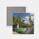 Aimant photo souvenir avec un petit bateau vert et un cabine en bois avec quelques grands arbres au bord de l'eau dans un paysage de fjord à Byglandsfjord, Norvège.