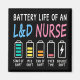 Humorous shift chart showing the battery life of an L&D nurse, also known as a labor and delivery nurse, with colorful levels from start to double shift. Ideal for maternity and birthing staff who enjoy relatable workplace humor.