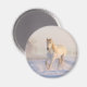 Un aimant avec une photo d'un magnifique cheval blanc. Traverser un champ couvert de neige. Majestueux et beau.