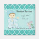 Un petit garçon garde-bébé mignon avec un bébé assis habillé en bleu sur un arrière - plan bleu pastel avec une grappe de roses. Le nom de l’enfant figure en haut dans les grandes lettres décoratives, et en bas et en bas, il y a aussi la date et l’heure de naissance de l’enfant. Au centre se trouvent les statistiques de naissance, la longueur et le poids. Un souvenir parfait pour le nouveau bébé garçon. Tout cela sur un arrière - plan motif de quatrefoil turquoise (bleu vert).