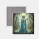 Une belle fée habillée d'une robe turquoise coulante et d'un collier de pierres turquoise, turquoise et sainte dans ses longs cheveux turquoise et ses ailes irisées en forme de libellule tenant une branche sainte se dresse dans une forêt magique entourée d'herbes, de rochers et d'arbres couverts de vignes.