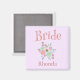 Ce bel aimant floral de mariée dispose d'un arrière - plan lilas avec une police rose qui dit "Mariée". En dessous, de belles fleurs roses et bleues. Ensuite, il y a un endroit pour insérer votre nom. Achetez le vôtre aujourd'hui !