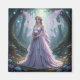 Une belle fée habillée d'une robe lavande coulante et d'un collier de perles avec des roses dans ses longs cheveux lavande et ses ailes violettes légères en forme de libellule tenant un rose se dresse dans une forêt magique entourée de fleurs bleues et violettes et d'arbres recouverts de mousse.