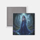 Une belle fée portant une robe bleu foncé coulante et un collier de saphirs avec des saphirs dans ses longs cheveux bleu foncé et des ailes translucides comme des libellules tenant un aster se dresse dans un étang peu profond dans une forêt magique entourée de maîtres, de champignons oranges et d'arbres couverts de vignes, de fleurs et de champignons.