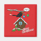 Illustration d'une maison d'oiseaux avec décorations de Noël de baies sèches et boules suspendues où un oiseau-noir chante et vous souhaite un joyeux Noël. Le toit est couvert de neige. Ce design est fait pour les fêtes d'hiver et les amateurs d'oiseaux.